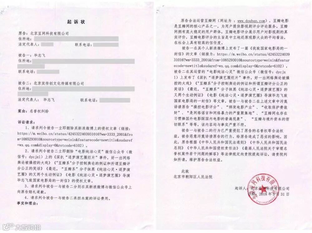 6月1日下午,@豆瓣电影 发了一条微博要起诉毕志飞:“毕志飞对豆瓣恶意诽谤污蔑,严重侵犯了豆瓣的名誉权等合法权益。”并要求毕志飞立即删除发表在多处平台的侵权文章并赔礼道歉,承担本案的诉讼费用。