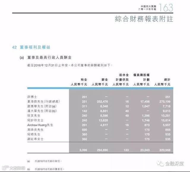 恒大集团 2016 年年报显示,该集团在董事及最高行政人员薪酬一栏中,10位高管的酬金总额为3.2亿元。其中,中国恒大的行政总裁夏海钧一人的年薪就高达2.7亿元,为董事中年薪最高的一位。恒大集团执行董事兼副总裁何妙玲的当年年薪为 1561.4 万元,副总裁徐文去年年薪为 1028.1 万元。