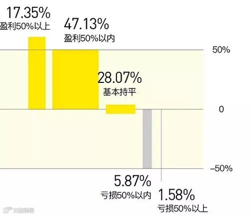 不过,盈利超过50%的比例仅占总人数的一成,而哪怕是内地基金经理,2017年的第100名也才实现了48.38%的收益。因此,投资高手还是占少数,而这一阿里员工很有可能是这17.35%中的一员,这个成绩也足以跑赢内地100名开外的基金经理了。