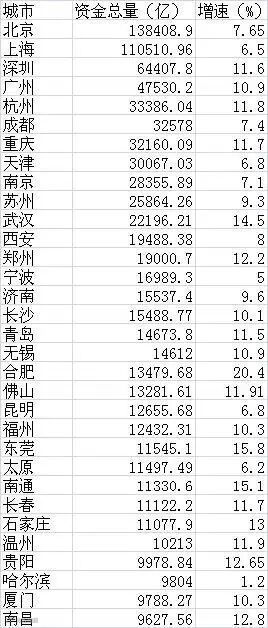 城市资金存量:京沪遥遥领先