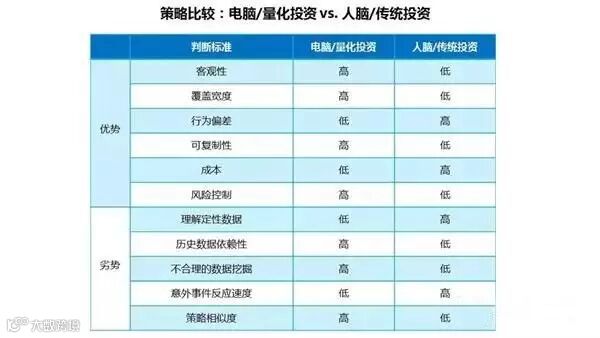 下图更全面地比较了电脑和人脑在投资策略上的异同,前面六项和后面五项分别是电脑相对人脑的优势和劣势。上面讨论过的关于石油公司两种投资思路的优缺点均有展现。图中其他几项判断标准也值得一提,比如量化投资的覆盖宽度更广。全球共有195个可投资国家,超过100种资产类别和5万种投资选择,其中光货币和大宗商品就分别有167和240种。量化投资的可复制性,不仅仅体现在一个在美国盈利的股票策略,可以被快速回溯检验是否在其他国家有效,是否在债券、货币等其他金融工具上有效,还体现在整个策略可以在一个基金经理离开后,快速被下一个经理学习掌握。而传统投资往往依赖于明星经理独特的才华和思维方式,不容易为接班人掌握和吸收。在成本上,量化投资前期研发费用和系统投入较大,但后期的费用因为雇佣人数较少而显著降低。从风险控制来说,量化投资在策略开发之初就会把不同的风险衡量指标纳入考虑,成为投资组合构造和再平衡的内在组成部分。