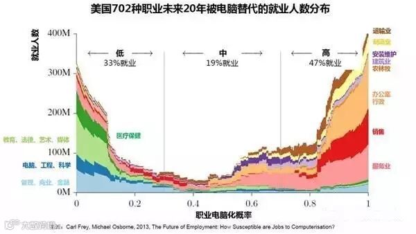 2013年牛津大学两位教授Carl Frey和Michael Osborne研究了美国702种职业在未来20年被电脑替代代的概率。下图显示金融业相对处于有利地位,该研究也显示在过去15年金融行业的从业人员一直在增加。有兴趣的读者可以找到这篇文章,找到自己职业对应的替代概率。