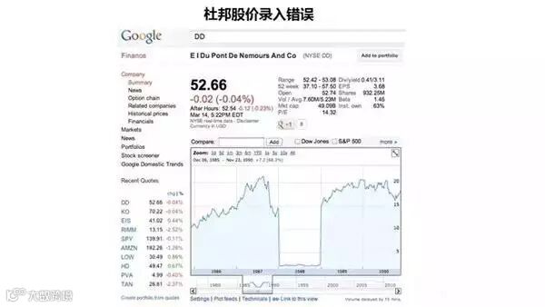 至于偏爱数据的Q,除了对公司高管的接触所获得的定性信息重视不够之外(当然如上讨论,这也可能是好事),有可能受到数据质量低的困扰。下图里的杜邦公司在1998年的股价异常原因是数据输入错误(实际当年股价始终高于12美元,Google直到现在也没有更正过来),类似情况在各种数据库中都可能发生。另外,处理公司数据从来都比大家想象的麻烦,关于同一个公司的不同数据和同行相比经常自相矛盾,这一点从分析师经常就同一家公司的业绩发表截然不同的看法可见端倪。当然如何处理这些数据,给予不同的权重,也是每个量化策略经理的看家本事。Q还有一个容易犯的错误就是对数据的“过度挖掘”,由于历史只有一次,许多被挖掘出来的赚钱策略只不过是巧合,未来就不成立了。投资领域一个广为人知的例子,是用孟加拉国的黄油年产量预测标普500指数下一年年末点位,准确度达到75%,加上奶酪产量,准确度就到了95%,但两者之间没有合理的经济解释。虽然Q会用很多方法尽量减低数据挖掘的负面影响,但在实践中,这种倾向难以避免。