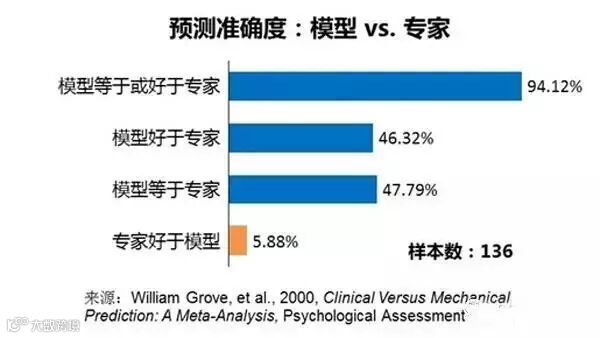 虽然油田开发的消息还没有公开,F和Q都将会买入ABC。应该说这个例子比较理想化,现实中很可能F和Q得出截然相反的结论,另外,这个例子对于投资的复杂性表现不足。例如,F也许没有意识到高管的乐观可能来自于和公司业绩无关的原因。天气晴朗,阳光灿烂,或者高管们钟爱的球队拿到了联赛冠军,都可能让他们展现出乐观的情绪。另外一个可能是,真正乐观的不是高管们,而是F自己。有足够的证据显示,分析师和基金经理常常过度乐观和过度自信。还有一个可能是,F因为种种主观的原因“爱”上了这家公司的股票,或者选择性地忽视掉了许多关于ABC不好的消息,这几个原因可以被统称为“行为偏差”。必须承认,行为偏差正是“专家输给量化系统的故事在其他领域同样不胜枚举”背后的原因,比如,美国一些州的监狱系统已经开始采取电脑模型,来决定哪些在押犯可以获得假释的机会,因为量化模型预估假释犯再次违法的准确度,要比传统假释委员会里专家们的判断高出许多。下图是与这个话题相关的136项研究的总结。更加有意思的是,一些领域的专家们在知道量化模型的预测后,他们做出的判断准确度依然比不过单纯的量化模型。