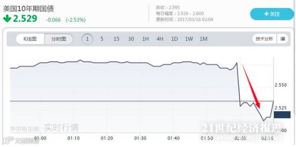 美联储加息决议公布前,10年期美债收益率处于2.57%上方,决议公布后跌破2.52%,日内跌幅扩大到3%以上。2年期美债收益率同样大跌,跌幅超过2.9%。