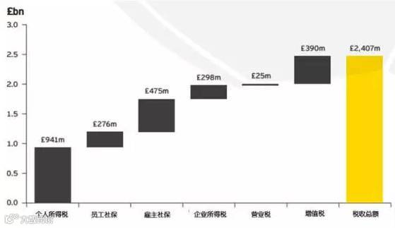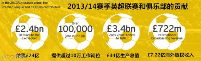 在2013-14赛季,英超为英国贡献了24亿英镑的财政收入。其中英超联盟支付了包括个人所得税、个人社会保险在内的8800万英镑。