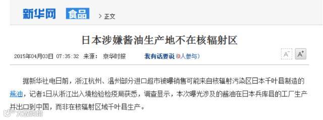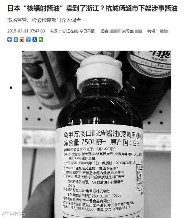 如上图所示,在2015年3月,浙江的一家媒体就爆料说,他们发现在当地超市里售卖的一款进口日本的酱油,其“制造商”一栏中的地址是日本千叶县,而这个地方恰好也在我国禁止进口的日本地区范围之内。