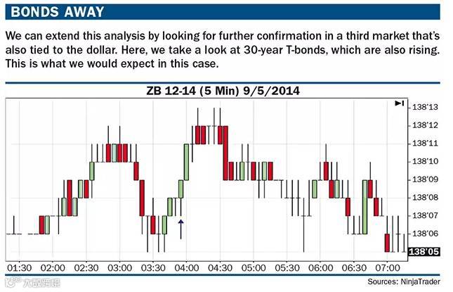 下图“Bondsaway”显示的是12月份的国债合约。注意在东部时间早上4点债券市场发生了什么。随着美元贬值,30年期的国债期货合约价格上升。这再次为显示了它们是负相关的两类资产。30年期的国债期货每跳一点的价值为31.25美元。这个时段它通常上跳5至9个点。