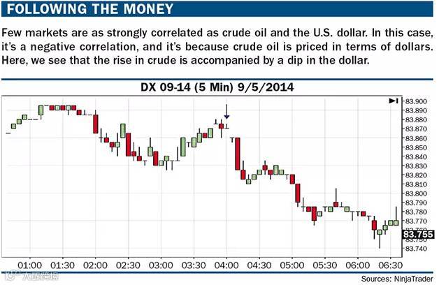 下图的“Followingthe money”显示相同日期相同时段美元的走势。注意其价值的变化情况。它的下跌显示了与原油的负相关性,确认了原油的走势。(注意此处显示的原油合约月份是十月,而美元指数的当月合约是九月)
