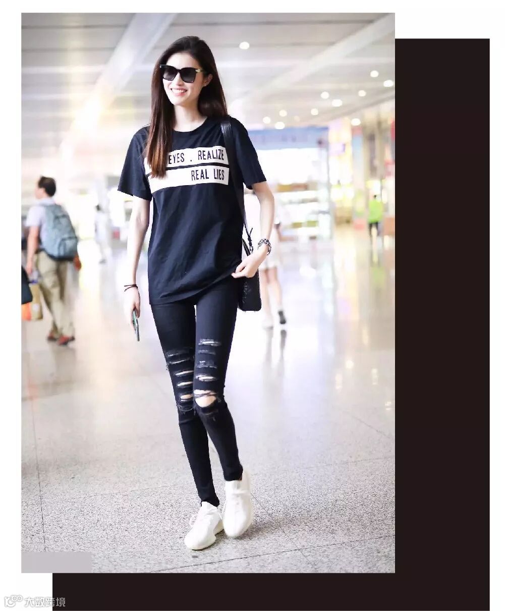 何仙姑黑色T恤&黑色破洞小脚牛仔裤,看似简单却十足的吸睛。