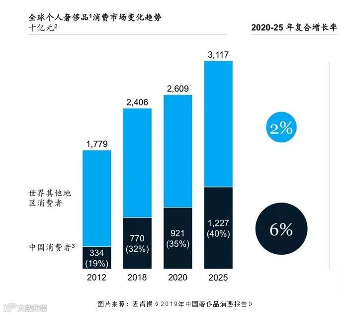 据中国新闻网,全球管理咨询公司麦肯锡26日发布的《中国奢侈品报告2019》首次聚焦中国的“80后”和“90后”,并预计至2025年,中国奢侈品消费总额有望增至1.2万亿元(人民币,下同),为全球奢侈品消费增长贡献65%。