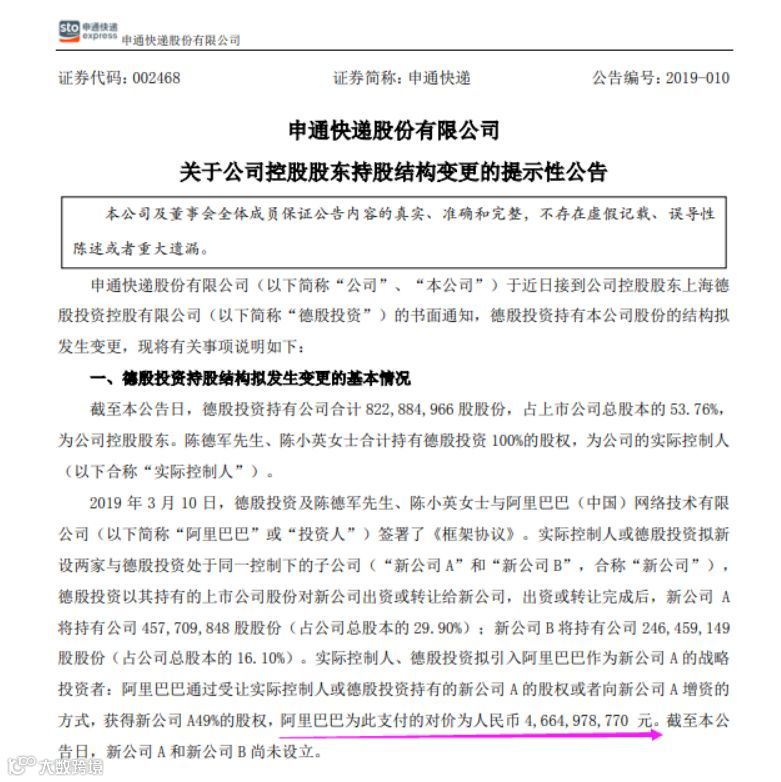 申通快递今早公告称,控股股东德殷投资拟新设新公司A,持有上市公司29.90%股份,阿里巴巴将获得新A公司49%的股权,支付对价为人民币46.6亿元。