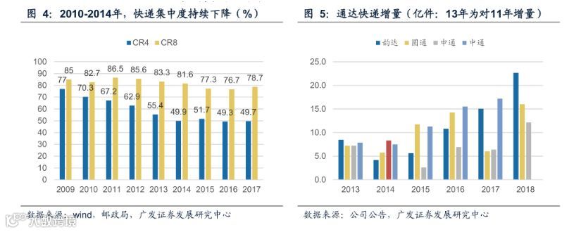广发物流行业研报指出,2014年以前,三通一达都没有大规模融资,主要依靠自有资本扩张。快递作为重资产业务,仅凭自我扩张难以跟上行业粗放式增长,此时的快递市场壁垒不高,新进入者仍有利可图,2009-2014年,CR4持续下滑。