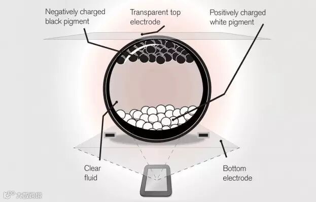 每个“小胶囊”的“天花板”(上表面)和“地板”(下表面)上,都被放置了电极。当正或负电场被加载到特定电极上的时候,带有相吸引电荷的小颗粒就会被吸引到“小胶囊”的上表面或者下表面,这样,“小胶囊”在外部看来就会呈现出特定的颜色了。