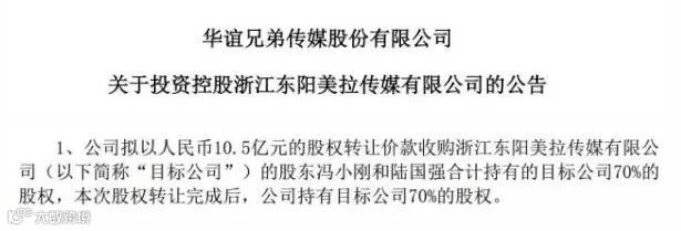 事情要追溯到2015年12月,华谊兄弟斥资10.5亿元收购浙江东阳美拉传媒有限公司70%股权。