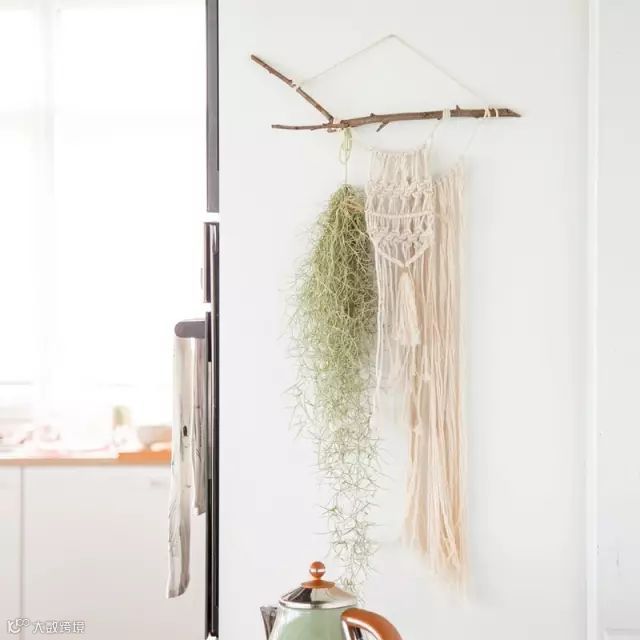 白色的墙壁太单调,爱手工的块块就把棉线织成了装饰物,外加一根枯木和晒干的杂草。