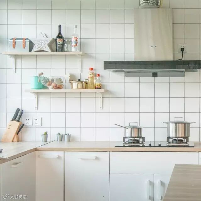 块块尤爱美食,所以厨房自然颜值和实力兼备。白色方砖搭配浅木色台面,厨具放不下就用搁板救援。