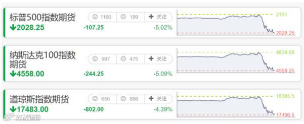 目前,日经跌逾5%,美股三大期指两个熔断。标普500期指跌5%,触及熔断;纳斯达克100指数期货同样跌5%;道指期货跌幅扩大至逾800点。但随后有所反弹。
