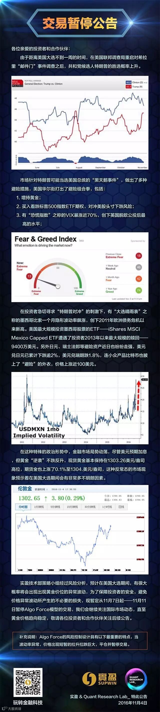 其实,早在美国总统大选的前三天,为了避免黄金市场异常波动所产生的风险和损失,实盈就已暂停了algoforce系统的交易,Quant Lab风险策略小组也成功预测到随着特朗普的获胜概率大大提升所带来的新一轮“黑天鹅事件”金融风暴,我们会持续关注国际市场动态,为投资者和合作伙伴带来最稳定安全的策略和做好最稳固的风险控制。