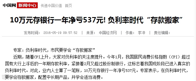 其实银行负利率并不是最近才出现的。大概五六年前,银行的利率就只有3.3%,而且不断下降,现在银行一年期的定期基准利率是1.5%,是非常低的。其实,从中国物价上涨,通货膨胀,CPI涨幅达到6%以上开始,中国的银行就进入了负利率的时代。