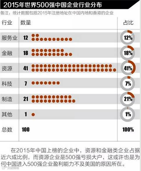 但经过数据分析后发现,2015年全球亏损最严重的50家企业中,中企已占到14席,大多为资源类国企,其中中国铝业以2015年亏损17.58亿美元居中企亏损榜首。而资源类、金融类公司是中企在世界500强的主力军,中资银行业在2015年也进入了成长拐点。