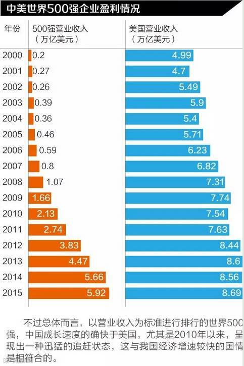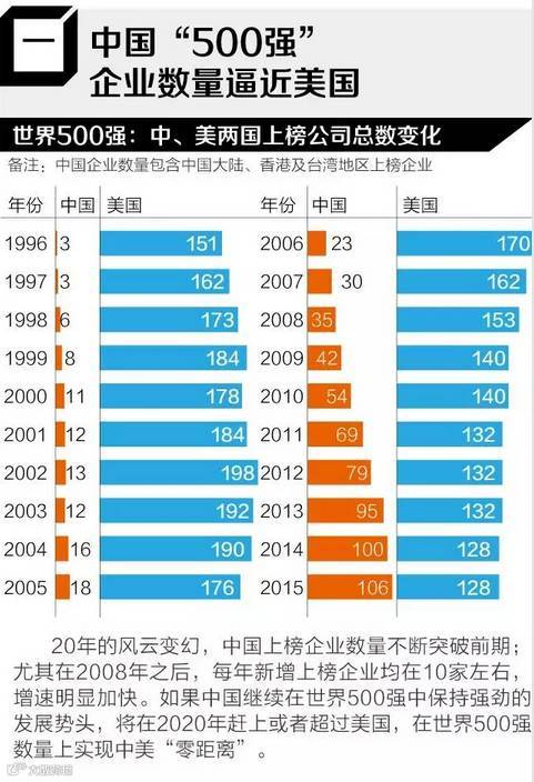 2015年世界500强榜单显示,中国企业上榜数量仅次于美国,位居第二。