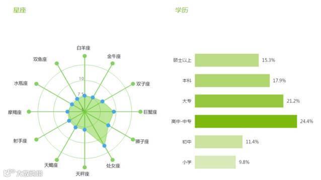 最后一个比较有意思的数据,可能因为主演胡歌是处女座的原因《琅琊榜》在爱奇艺的用户群体处女座要明显比其他星座的人群多。明星偶像的星座对粉丝的影响力有多大,目前尚未有研究可以详细说明。