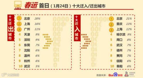 春运首日十大迁入/迁出城市