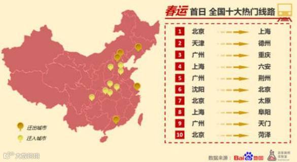 由百度地图提供的大数据,可以分析得到全国人流量最大的实时迁徙路线,和人口流入、流出规模最大的城市。数据显示,在排名前十的热门迁徙线路中,