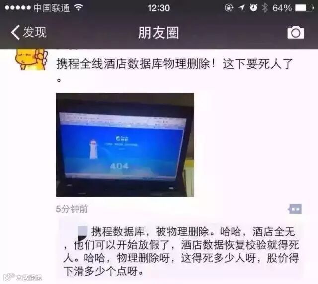 称,“一般会有异地容灾,跟介质备份。这种网站不会容忍宕机10分钟,那些容灾方案无效,这么久还没回复说明很有可能携程有内鬼!这样级别的数据库都是按照机房完全物理损毁做备份以及容灾方案的”。