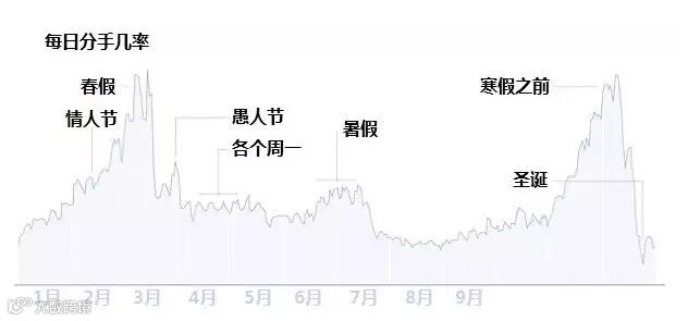 出乎意料的是,情人节和春节期间并非情意融融的季节,而是处于攀升分手高峰的趋势中。