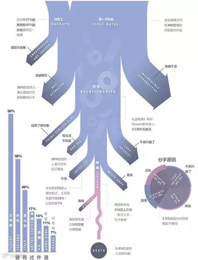 在全世界范围,每天约有300万对情侣开始首次约会。以美国为例,每年250万人宣誓结婚,同时超过100万对夫妇离婚,还有,5.4%的美国人一辈子到死都没结过婚。