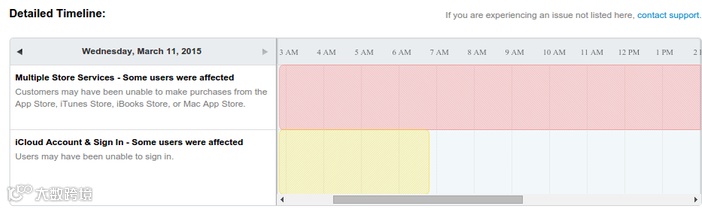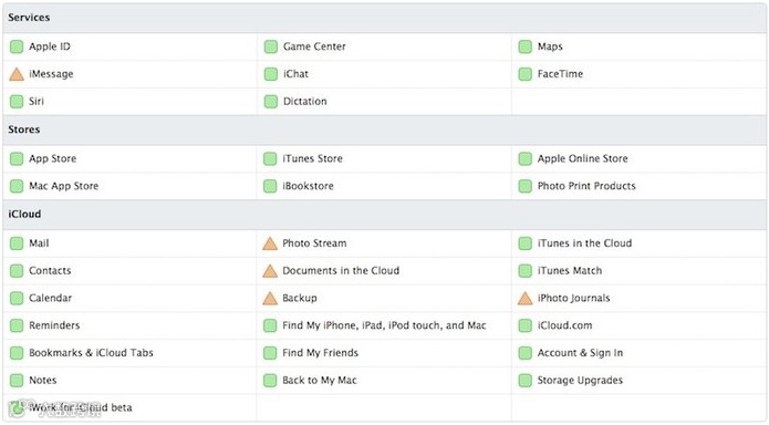 苹果官方系统状态页面显示,宕机开始于北京时间昨天下午 5 点,持续至今天凌晨 4 点左右,中断时间持续 11 个小时左右。