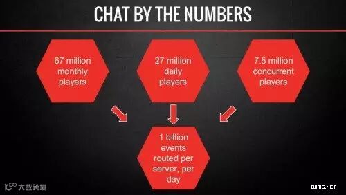 如上图所示,该游戏的聊天服务需要支撑750万并发用户,2700万日活跃用户,每秒钟需要处理的消息上万条,每台服务器每天处理消息达十亿条。