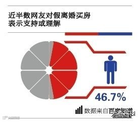 对百度知道关于“假离婚买房”的74,368条讨论进行大数据分析可以看到,关于这个问题53.3%的网友表示反对,46.7%网友表示支持或可以理解。 值得一提的是,在超过半数反对假离婚的网友中,75%人给出的理由是“风险太大,担心假戏真做”,仅有25%认为“情感上接受不了”。在动了假离婚买房念 头的家庭中,八成左右是由老公提出的建议,同时有两成左右网友表示,是房地产销售和中介给他们支的招。