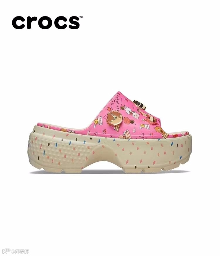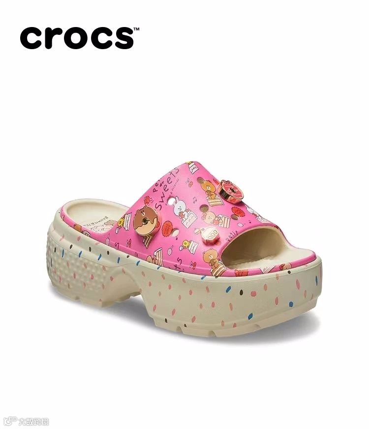 联名经典洞洞鞋,以小巧的印花设计将布朗熊、可妮兔、丘可以及莎莉的多样造型呈现于奶油色鞋面之上,鞋侧以三条轻柔活泼的色块贯穿,呼应鞋款通体印花色。配备了四款同形象的毛绒智必星鞋花,软乎轻巧、俏皮可爱。鞋款更是在铆钉细节 处印制了布朗熊的面部形象,童趣盎然。