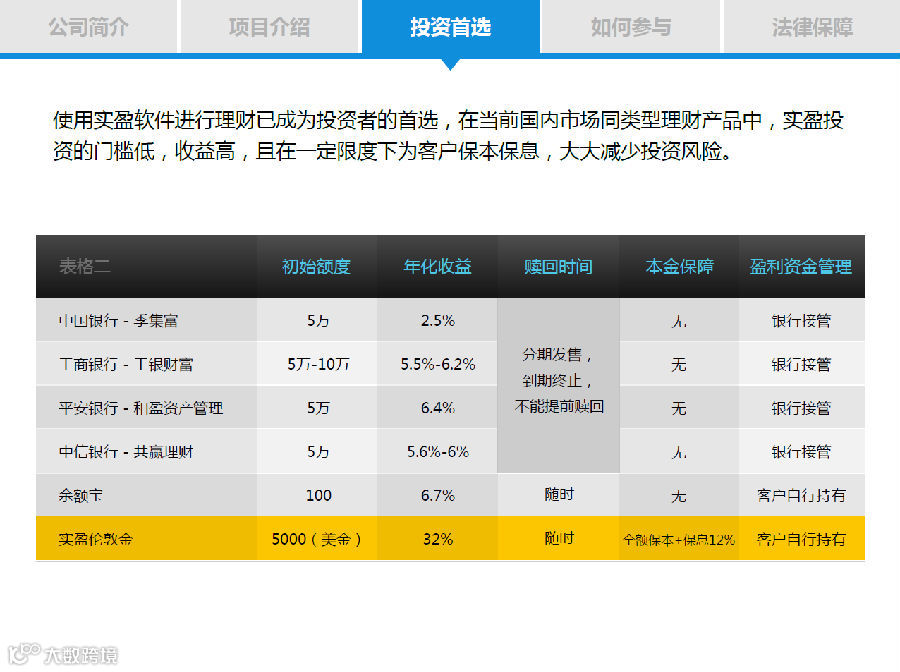 2、相比起银行,证件公司和电子钱包等资金管理机构,实盈优势明显且突出。首先是5000美元低门槛投资起步,其次是强大的资金流动性,第三是32%收益高回报成为投资大热。
