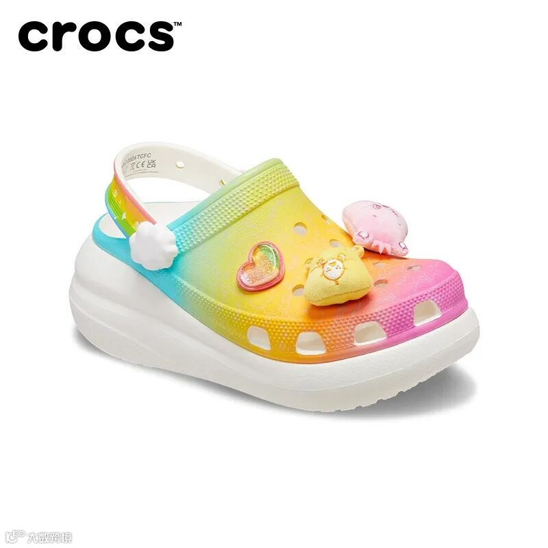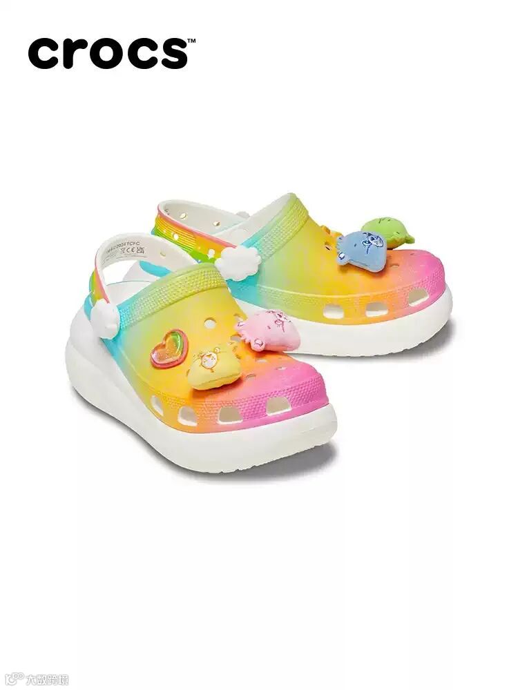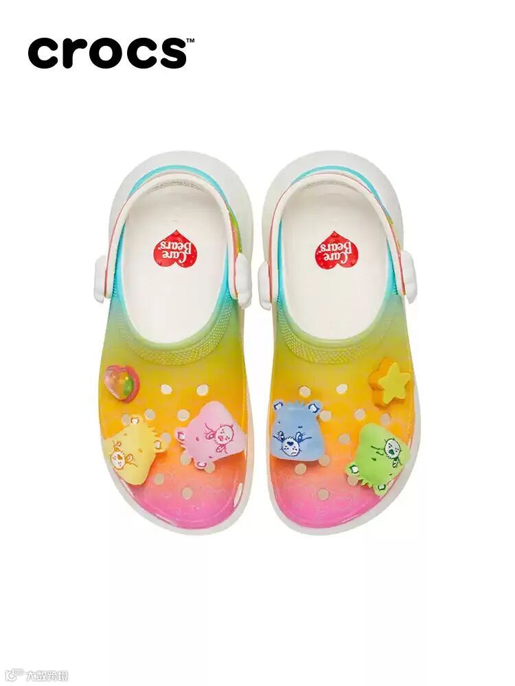 Crocs 与近年火爆的动画IP —— 爱心熊 Care Bears 携手合作,推出彩虹般色彩的厚底泡芙凉鞋。