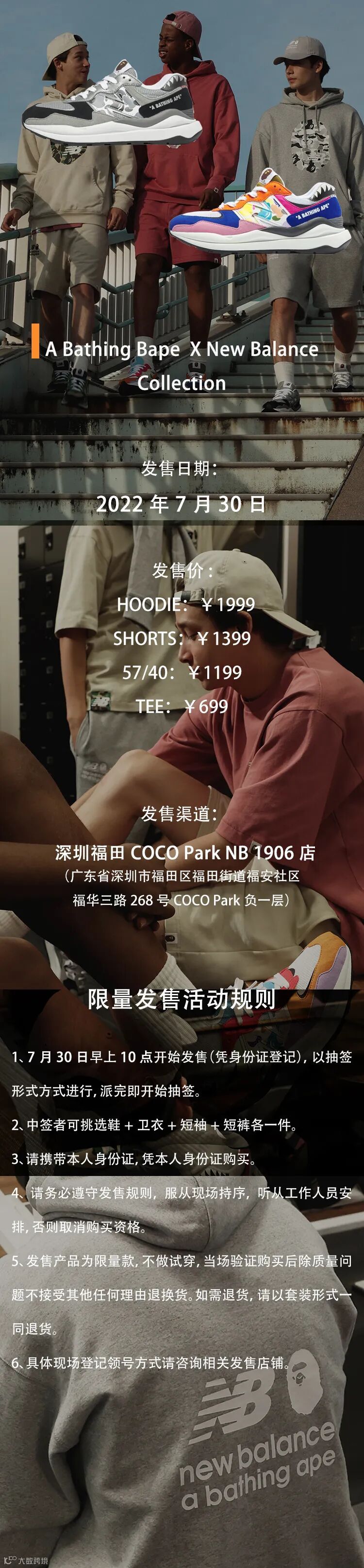今季,国际知名运动品牌 New Balance ,再度联手好朋友 —— 来自日本街头品牌 A BATHING APE ®(Bape ®)发布全新的联乘套装。 以 New Balance 「57/40」「Clothing」为载体再次打造新一季的「Bape®」帝国。