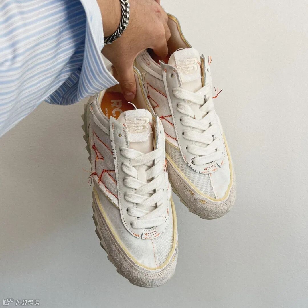 修长的鞋身,缝纫式的补丁,橙色、红色交织,不理清线头的 N 字母,网面、纺织布拼接,黄色的海绵填充物,上个世纪 60-70 年代 ,锯齿状橡胶大底。构成了这双 「伍岳式复古美学 —— RC30」。