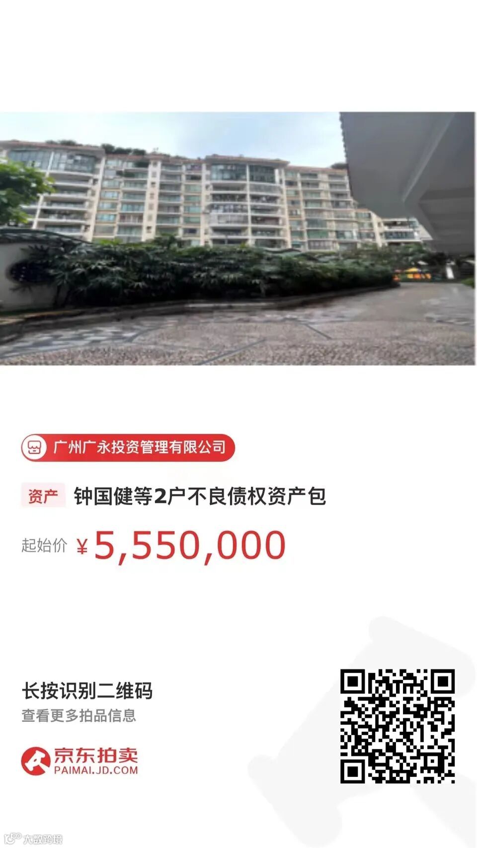 广州广永投资管理有限公司将于2024年1月24日起至2024年1月31日16时止在京东网资产交易平台对钟国健等2户不良债权资产包进行公开挂牌转让,转让基准日为2023年12月31日,转让底价为人民币555万元。