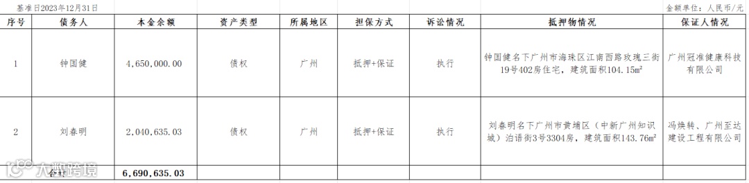 钟国健等2户不良债权资产包的债权金额及担保情况如下: