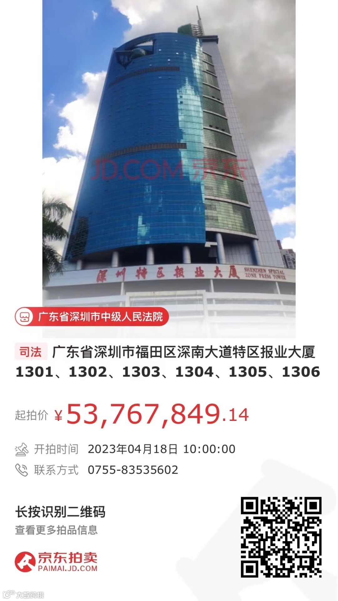 一、拍卖标的:广东省深圳市福田区深南大道特区报业大厦1301、1302、1303、1304、1305、1306房;
