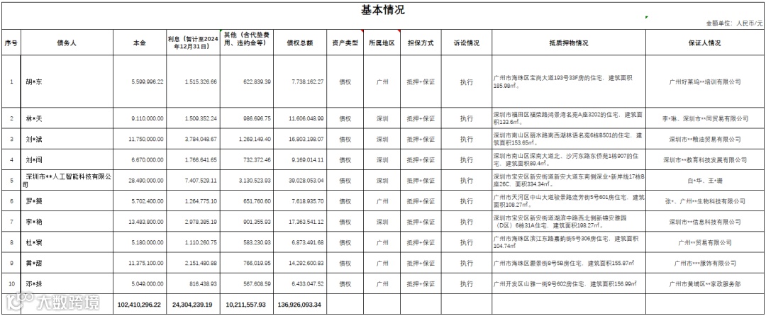 1、广州广永投资管理有限公司拟公开征集胡*东等10户不良债权资产项目的意向客户,项目基本信息如下:债权总额为人民币13,692.61万元,其中,本金余额为人民币10,241.03万元,利息为人民币2,430.42万元,其他1,021.16万元。