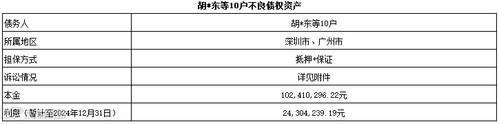 广州广永投资管理有限公司拟公开征集胡*东等10户不良债权资产项目的意向客户,项目具体情况如下: