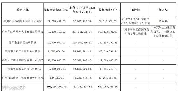 广州广永投资管理有限公司将于2025年8月11日9时至2025年8月11日16时止(延时的除外)在京东网资产竞价网络平台上(网址:https://auction.jd.com/paimaiShops.html?verdorId=780691)对惠州市大海洋实业有限公司等7户不良债权资产包开展公开转让。转让标的物为惠州市大海洋实业有限公司等7户不良债权资产包,转让基准日为2025年6月30日,债权情况如下: