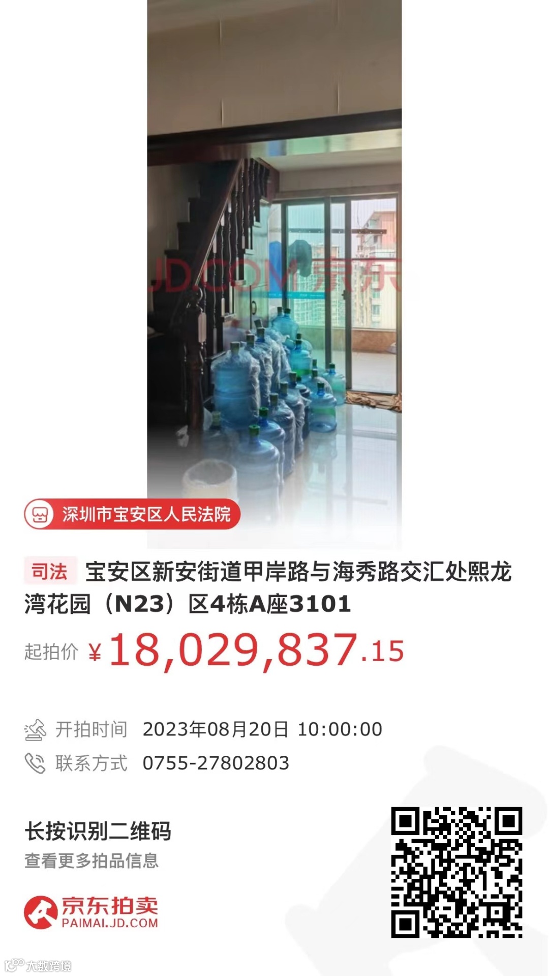 深圳市宝安区人民法院将于2023年8月20日10时至2023年8月21日10时止(延时除外)在深圳市宝安区人民法院京东网司法拍卖网络平台上进行公开拍卖活动(网址:http://sifa.jd.com/2581,户名:深圳市宝安区人民法院),现公告如下: