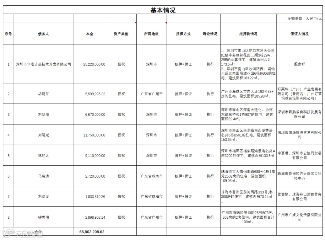 广州广永投资管理有限公司拟公开征集深圳市华唯计量技术开发有限公司等8户不良债权项目的意向客户,项目基本信息如下: