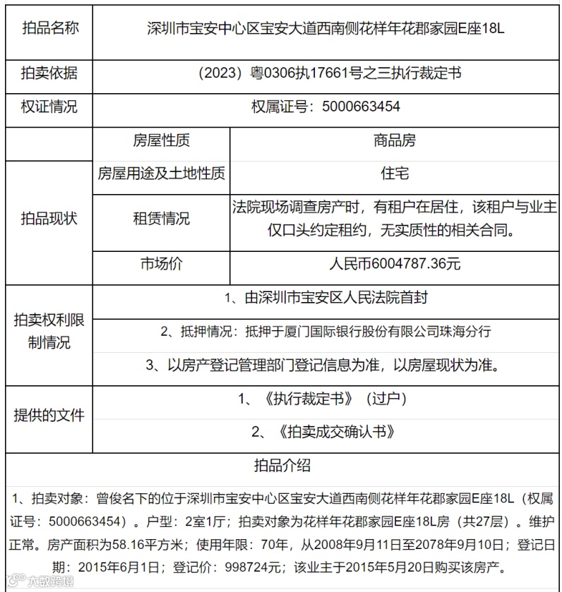 深圳市宝安区人民法院于2024年2月3日10时至2024年4月3日10时止(延时的除外)在深圳市宝安区人民法院淘宝网司法拍卖网络平台上进行公开拍卖活动(法院账户名:深圳市宝安区人民法院,拍卖网址:https://sf-item.taobao.com/sf_item/763624190469.htm?spm=a213w.7398504.paiList.1.2e501e4b1Xggq3&track_id=a9258aef-7171-4467-a69a-736deeb4f981),详情如下:
