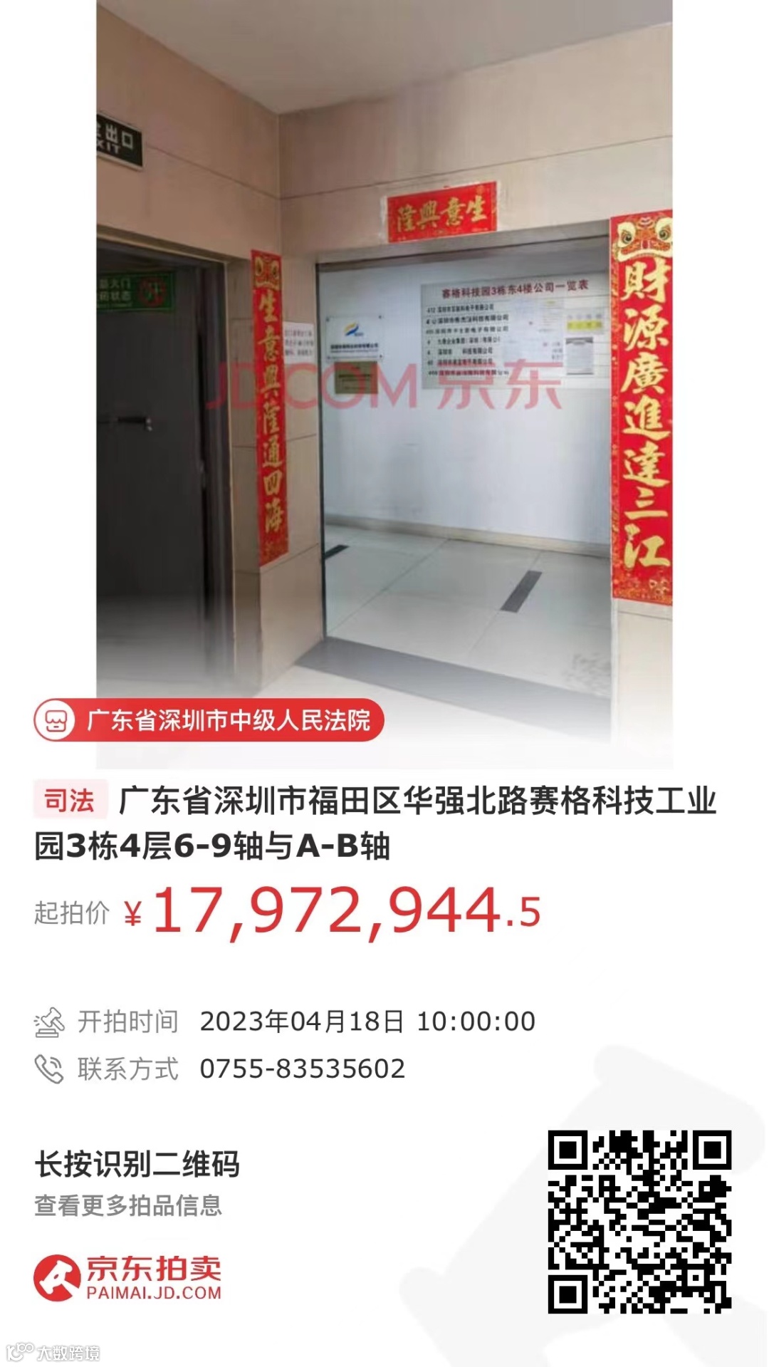 一、拍卖标的:广东省深圳市福田区华强北路赛格科技工业园3栋4层6-9轴与A-B轴;
